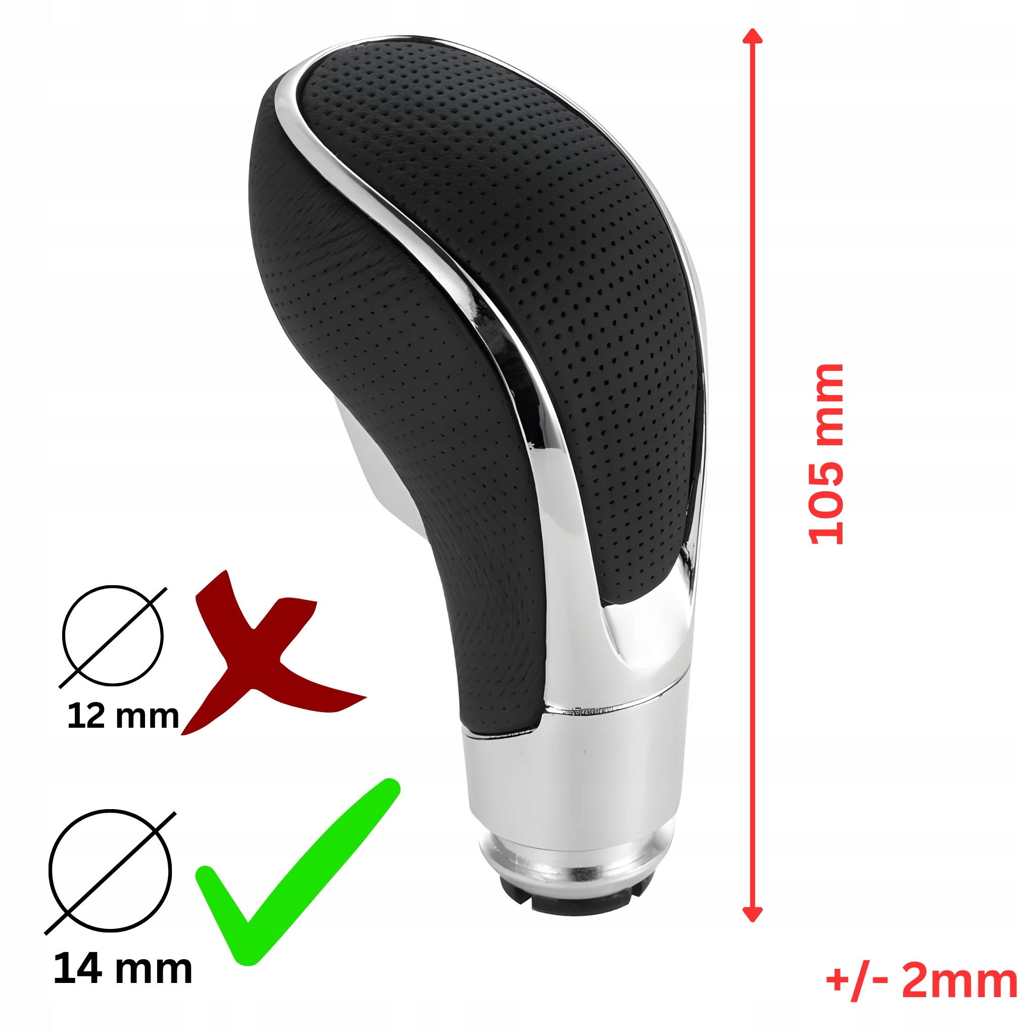 Lista modeli ma charakter podglądowy, aby odpowiednio dobrać gałkę zmiany biegów najlepiej jest porównać obecnie zamontowaną w samochodzie. Gałka pasuje wyłącznie do drążków 14mm - w niektórych wersjach występowały także drążki 12mm i w tym wypadku gałka nie będzie pasować. Zatem najlepiej jest zmierzyć drążek na którym obecnie zamontowana jest gałka.