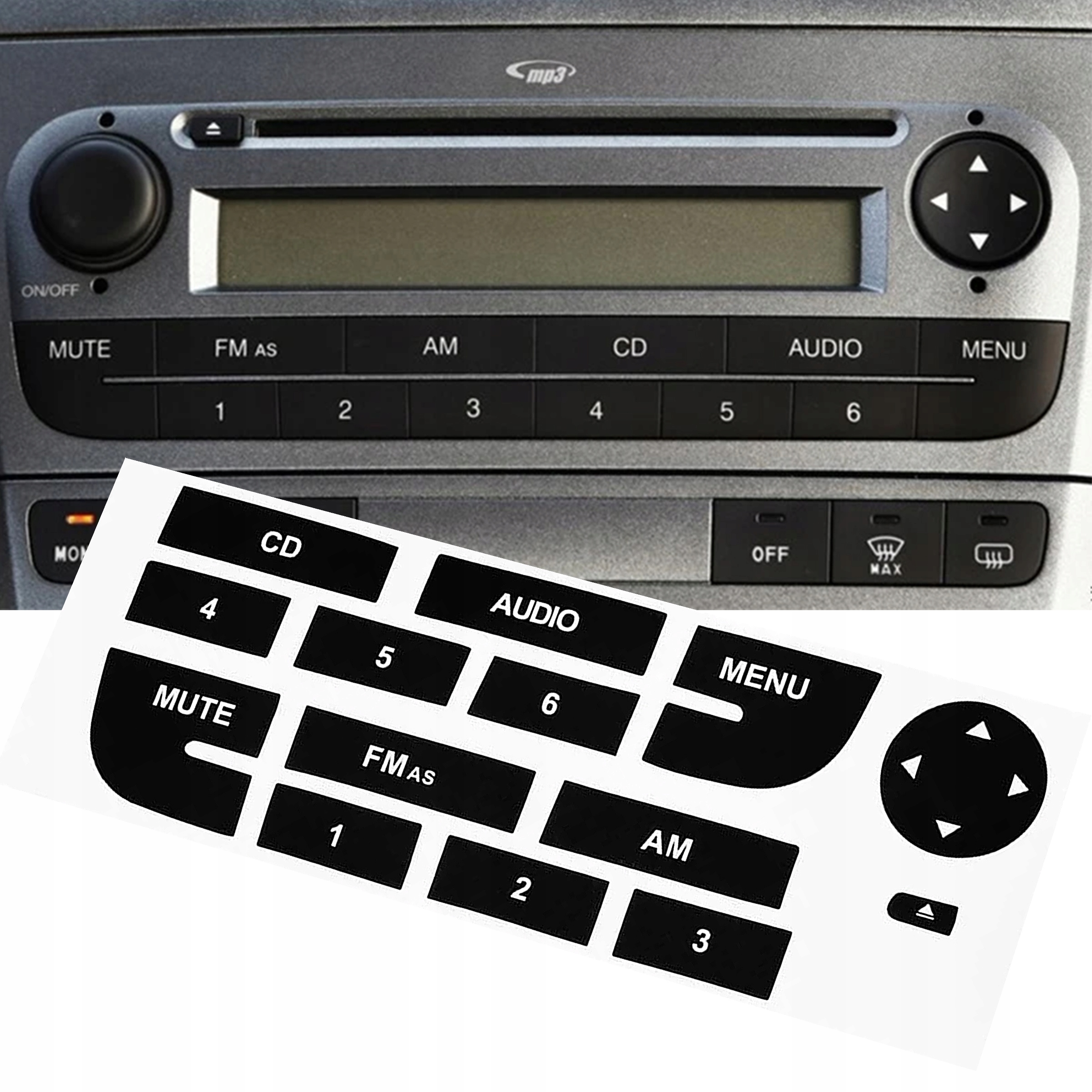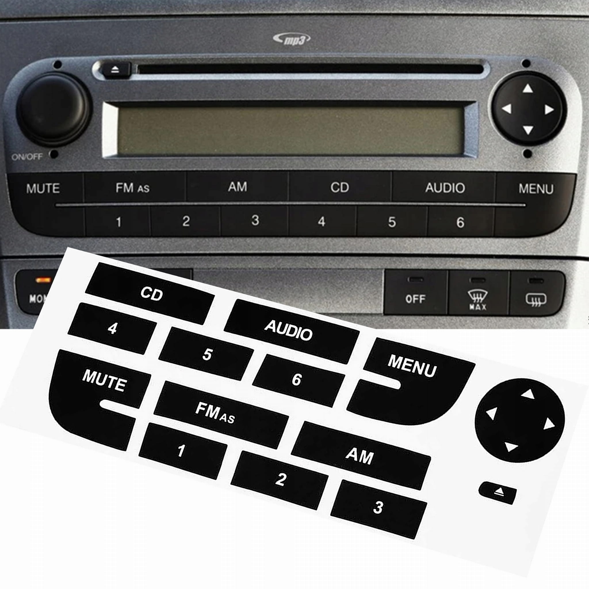 - Pasują do panelu widocznego na zdjęciu - naklejki dostępne w tej ofercie pasują do wzoru panelu radia widocznego na zdjęciu. Jeśli w Twoim samochodzie jest inny panel radia, naklejki mogą nie pasować.
